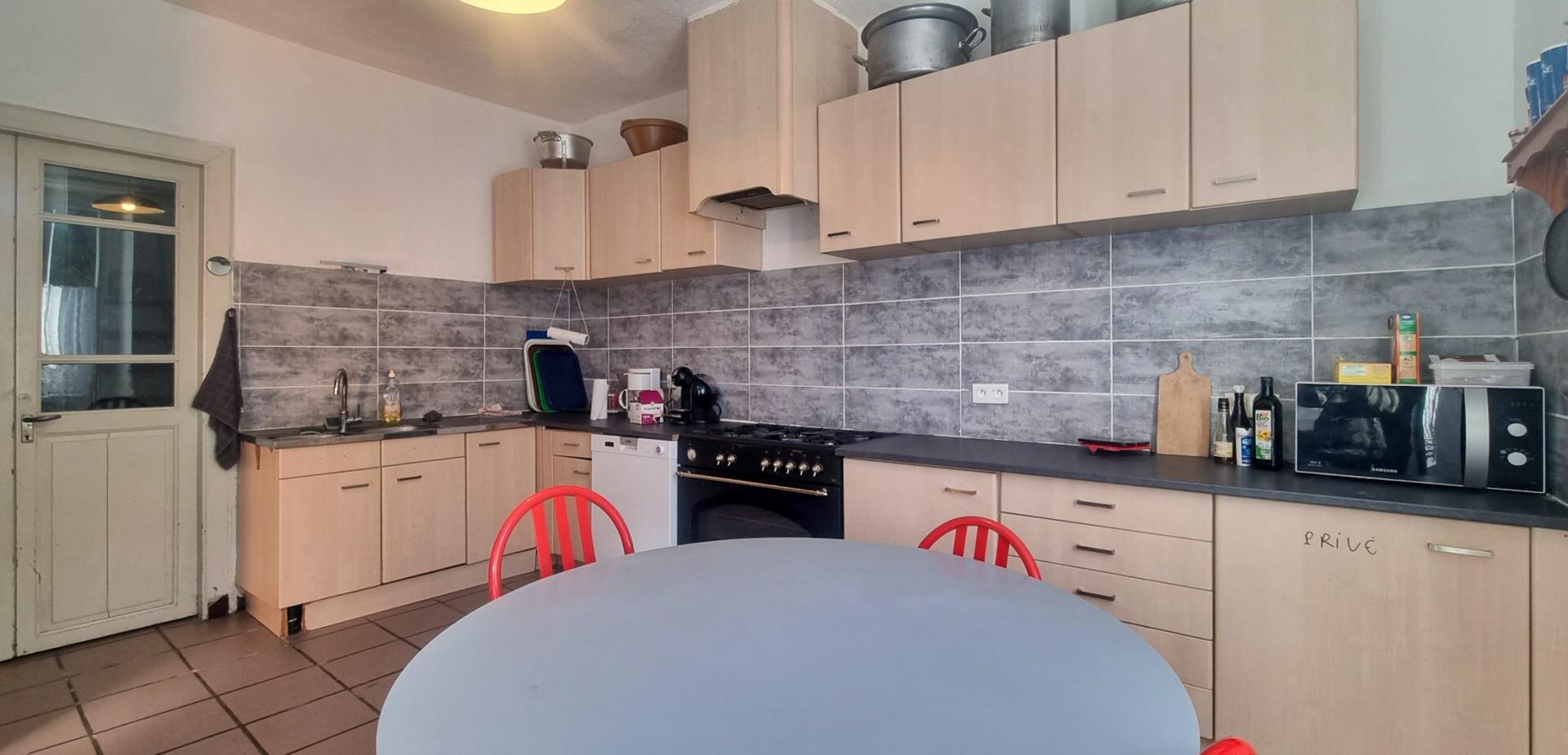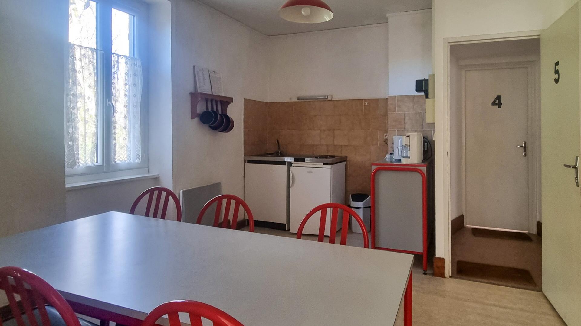 A dining room and communal shared kitchen.