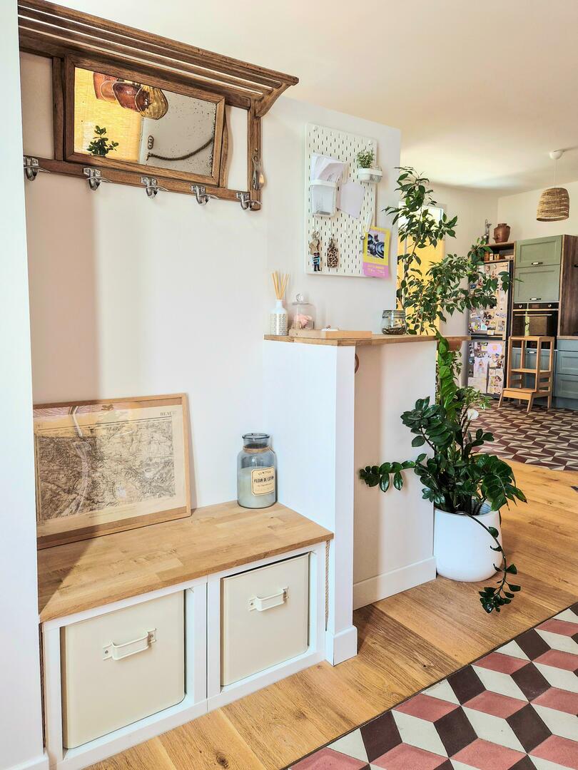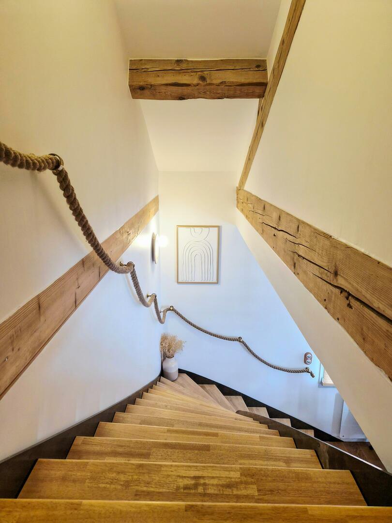 Solid oak floors, cement tiles, terrazzo, and exposed beams